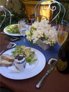 What could be better on a sunny Los Angeles Valentine’s day than an impromptu al fresco brunch?  I made a simple frisee salad with white balsamic vinaigrette, pecans, and parmesan shavings to accompany the coddled eggs with shaved black Perigord truffle all washed down with a fine glass of Dom Perignon.  To make coddled eggs, firstly, one needs egg coddlers.  Egg coddlers are porcelain cups with metal screw-on lids and a ring at the top.  They may be difficult to find.  Mine are from Royal Worcester, who I believe invented the egg coddler.  Butter the inside of the cup.  In the bottom, I put a little cheese.  This time I used Boschetto, a truffle cheese from Italy.  In go two eggs, then a splash of cream and some salt and pepper.  The lid is then tightly screwed onto the egg cup and the cups are lowered into a saucepan of gently boiling water.  I boil them for about 8 or 9 minutes, so the yolks are still runny but the whites set.  I top them off with shaved black truffle.  Served with crusty bread, Heaven!  Here’s hoping your Valentine’s day is filled with delicious moments!