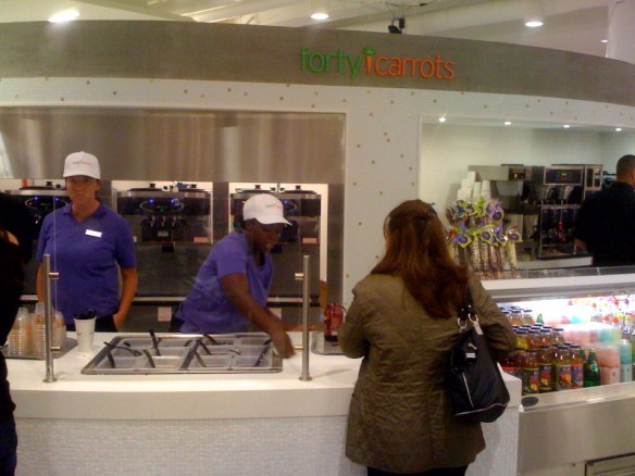 Toddrickallen got a glimpse inside the brand spanking new Bloomingdale’s inside the glitzy Santa Monica Place at their pre-opening event on Thursday night.  Needless to say the look of the store is ultra fab.  I was surprised to see a frozen yogurt/coffee shop on the top floor.  The name of the shop is Forty Carrots and, it was explained to me, is a house brand for Bloomie’s (just in case you’re stricken with a sweet tooth while shopping for David Yurman).  They were certainly doing a brisk business handing out samples…