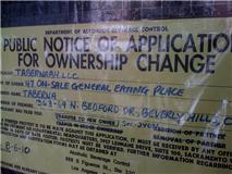 I noticed this ‘change of ownership’ sign at the run-down and pufferfish-less restaurant space that was Luau restaurant at 369 N. Bedford in Beverly Hills. The sign states that a new restaurant named Taberna will be taking over. The sign describes it as an “on-sale general eating place”. Can’t get much more descriptive than that. I wish them well, that space has not been kind to many other previous inhabitants…