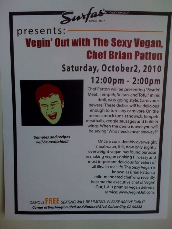 Chef Brian Patton “The Sexy Vegan” of vegan delivery service Vegin’ Out (www.veginout.com) will be presenting a vegan cooking demonstration at Surfas this Saturday, Oct 2nd from 12:00pm to 2:00pm. His Sexiness has given his demo (we can assume intentionally) the suggestive name, “Beatin’ Meat: Tempeh, Seitan, and Tofu“. In addition to learning how to make mock tuna sandwiches, veggie sausages, and buffalo wings, you just might learn how to drop the letter ‘g’ off various verbs like veging and beating. (Just a quick question: If you had chosen to name your presentation “Beatin’ Meat”, would you have chosen to use the same artwork in your poster?) Demo is free. Surfas is at the corner of Washington Blvd. and National Blvd. in Culver City. Check out http://www.surfaslosangeles.com/ for more info.