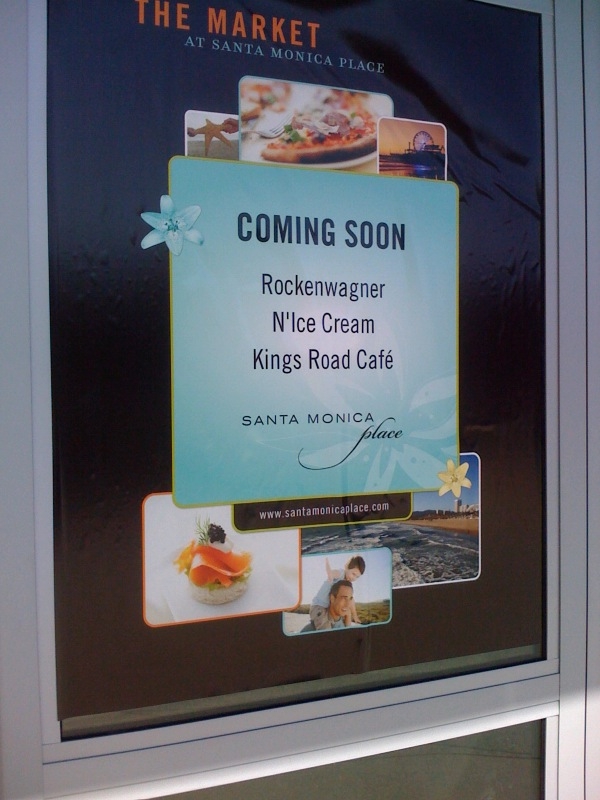Construction continues at a dizzying pace at The Market, the “Ferry Building style” marketplace set atop the brand spanking new Santa Monica Place.  Words like “local” and “organic” feature heavily in the promos.  What we DO know is that, according to the sign, Rockenwagner, N’Ice Cream, and Kings Road Cafe are slated to move in.