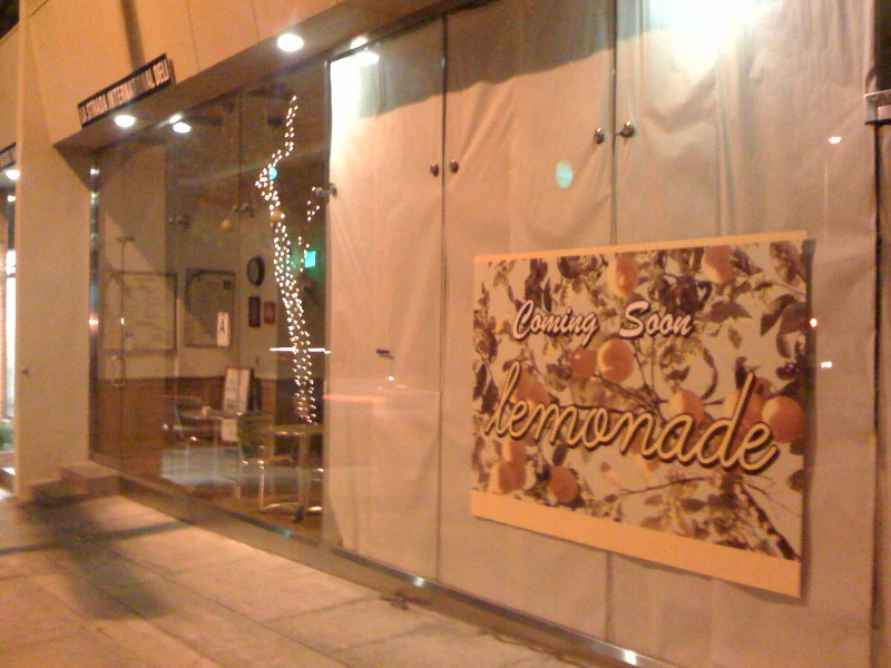 I just noticed the sign up tonight in the old Claypit Indian Restaurant space at 145 Barrington in Brentwood Village announcing that the fresh and cheerful restaurant Lemonade will be moving in. With four locations in LA and one in USC, it looks like the upscale lemonade stand in spreading out. Check out the menu here http://lemonadela.com/menu-ii to see what you’re likely to get besides sugary citrus beverages.