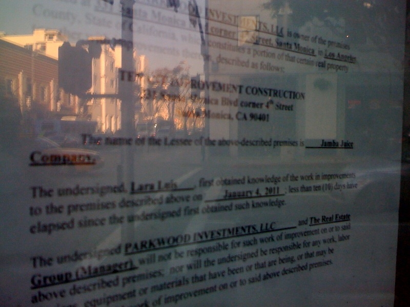 While we’re on the subject of out with the old, in with the new, it looks like Leonidas, the Belgian chocolatier at the corner of Santa Monica and 4th in Santa Monica has called it a day and it didn’t take long for the store to be stripped to the bones. There is a sign on the door stating that Jamba Juice is renovating the space. As confirmed by an employee at the Jamba Juice almost across the street on Santa Monica Blvd, they will be moving into the new location sometime around the end of February.