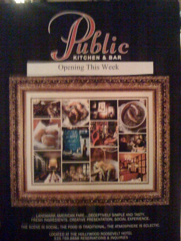 Tim and Liza Goodell’s newest, Public Kitchen And Bar opened last night (Monday) in the Roosevelt Hotel at 7000 Hollywood Blvd in Hollywood. Expect a menu of casual American in a relaxed bright and airy space. The concierge at the hotel showed me the menu, but insisted that it wasn’t yet finalized and asked me not to photograph it. But all of the items previously listed on EaterLA were verbatim on the menu. Read more at http://la.eater.com/archives/2011/02/15/public_kitchen_bar_launches_within_the_roosevelt_feb_28.php or at http://www.thompsonhotels.com/hotels/la/hollywood-roosevelt/eat/public-kitchen-and-bar.