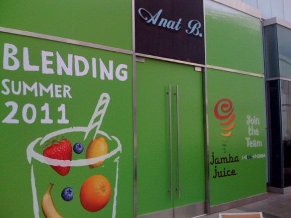 As we gear up for summer, the Century City Shopping Center has been a flurry of activity: BJ’s opened this week, Vanilla Bake Shop and The Counter are coming soon, as are two newbies in the food court. And yet one more… It looks like Jamba Juice will be opening in the old Anat B. space on the second floor sometime this summer. http://www.jambajuice.com/