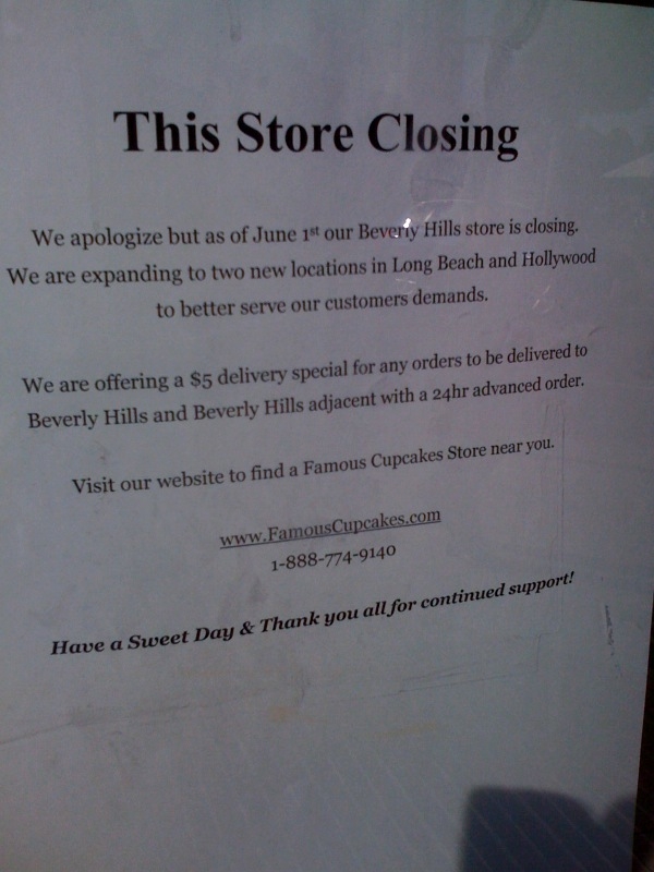 Open since October 2009, Famous Cupcakes on the corner of South Beverly and Charleville in Beverly Hills is now closed. The sign on the door suggests that they are putting their efforts behind two new locations in Long Beach and Hollywood instead. If you need your Famous Cupcake fix, the small chain still has stores in North Hollywood and Van Nuys and retails in various other locations or, as a consolation prize to Beverly Hills, they are offering a $5 delivery special to the bereft city. http://www.famouscupcakes.com/