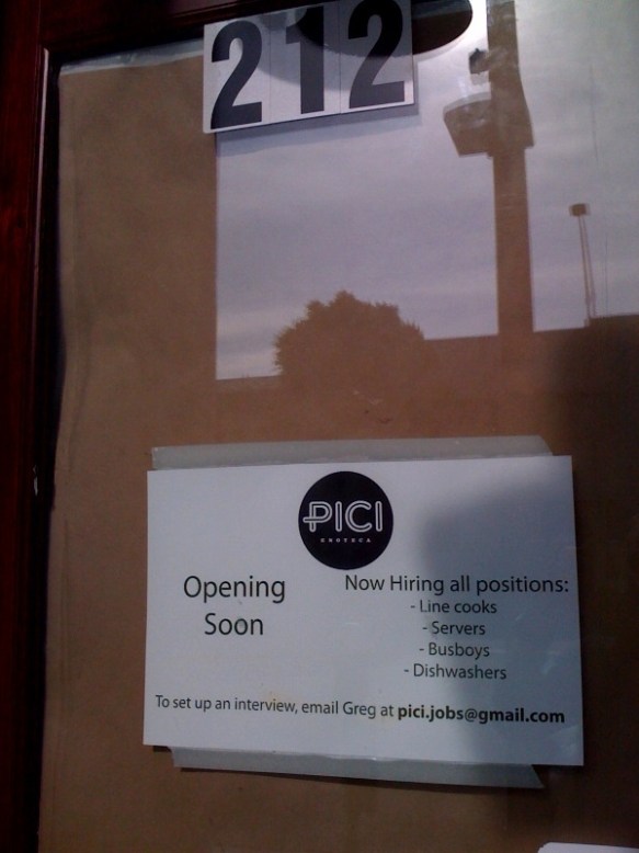 It looks like Pici Enoteca the new self-described “rustic NY-style Italian eatery” going into the old Bossa Nova space at 212 S. Beverly Drive is officially hiring.  After an expected opening of late last year, things must finally be coming together for owner Jeff Vespa and chef Jason Harley at the small restaurant with an equally diminutive price range:  all dishes are under $12!  Check out more (but not much more…) at their Facebook page:  http://www.facebook.com/group.php?gid=152034411491316