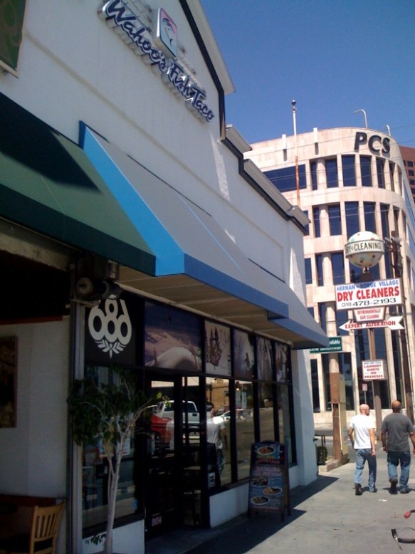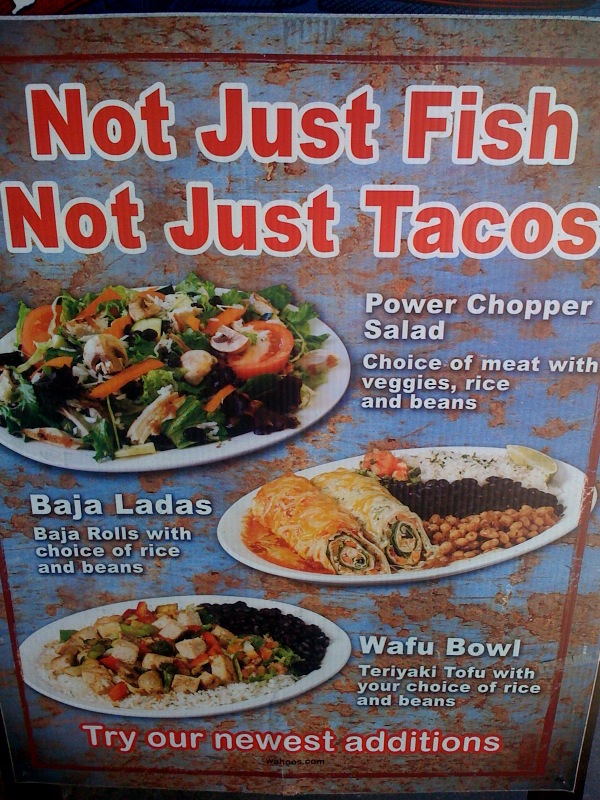 Perhaps the last place one would expect to find substantial vegetarian food would be a restaurant specializing in fish tacos. But Wahoo’s Fish Taco, in addition to already offering tofu, mushrooms, or vegetables as fillings for tacos, apparently recently added a Wafu Bowl to its menu: teriyaki tofu with choice of rice and beans. I noticed the sign walking by the Wahoo’s next to the new Seed Bistro. So the answer is yes, you can get veggie food at Wahoo’s. Read more here: wahoos.com.