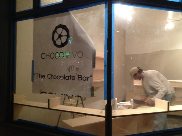 Already a fixture at local farmer’s markets, Chocovivo, the “bean to bar” specialists are working fast and furiously on their new boutique, The Chocolate Mini Bar at 1504 Abbot Kinney Blvd. in Venice. Passionate about chocolate, they only offer dark chocolate that is stone ground, organically raised, gluten-free, made in small batches, and sourced from a family plantation in Tabasco, Mexico. Although by the looks of this photo taken last night they have a way to go, I was told by Alex Conn (VP of strategic development) that they are planning on a soft opening this weekend. Read more at chocovivo.com.