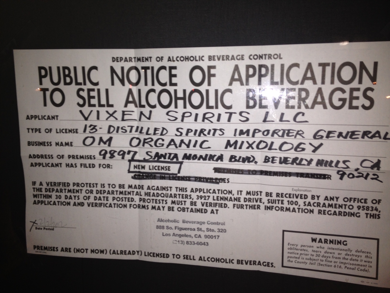 While we’re on the subject of businesses moving into Beverly Hills, I noticed this application posted at 9897 Santa Monica Blvd., the site of the former K Chocolatier. It looks like something called Om Organic Mixology is applying for a liquor license. I can’t find much on the web about them, except that they’re a new, environmentally conscious vodka company billing themselves as “the enlightened cocktail”. You can read their launch page here: omcocktails.com/om-cocktails-2. I’ll keep my eye on this one…