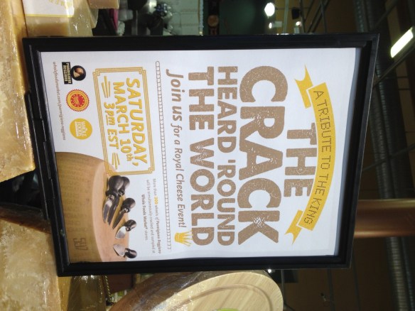 You could be forgiven for thinking that “The crack heard ’round the world” was a reference to your old, flatulent college roommate, but it isn’t.  On Saturday, March 10th, in a promotional event, Whole Foods stores will simultaneously be cracking open over 300 wheels of authentic Parmigiano Reggiano.  The “The crack heard ’round the world” occurs at 3:00pm eastern time and samples will be offered.