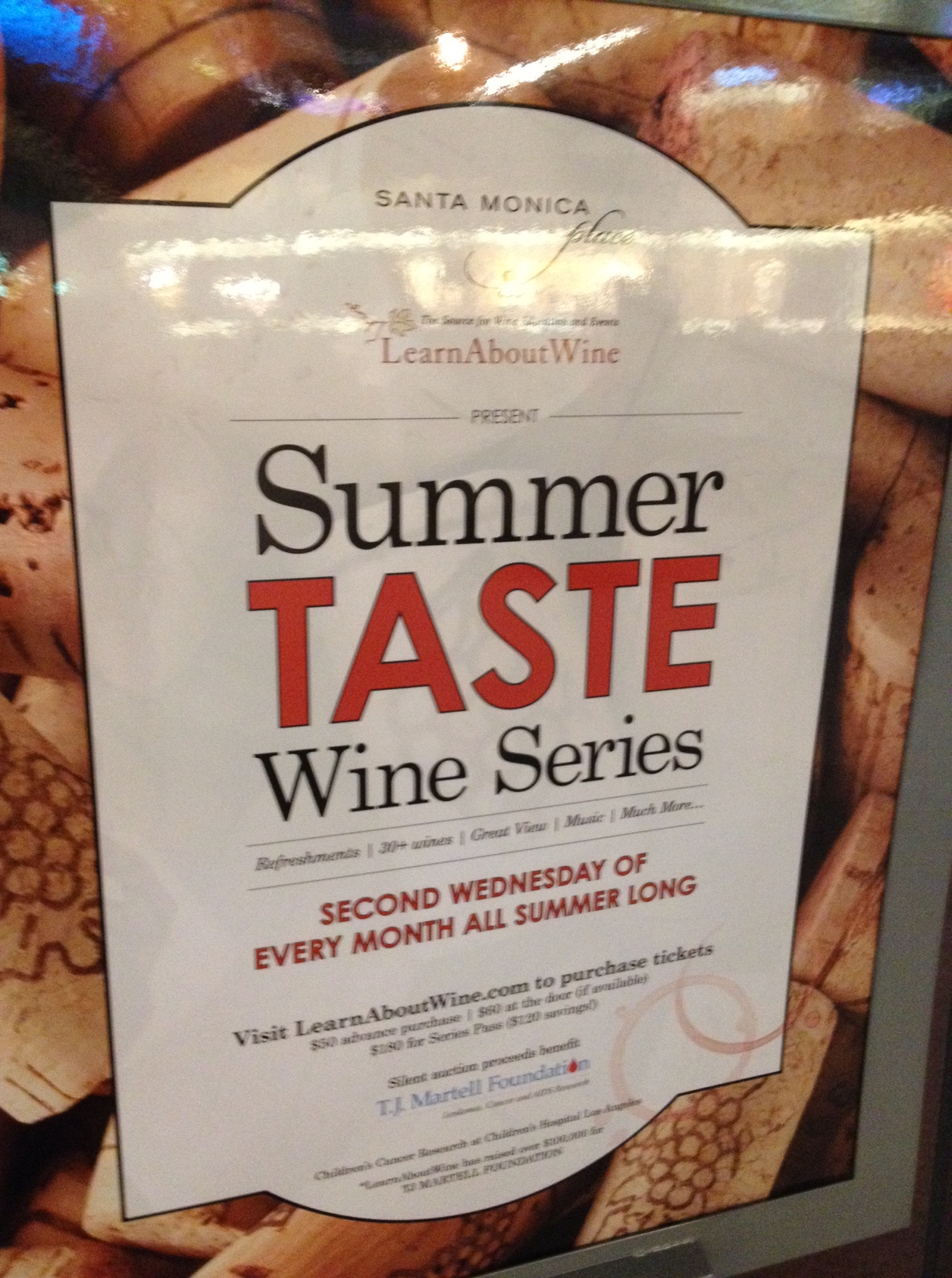 While we’re on the subject of Santa Monica Place, starting tonight and running the entire summer on the second Wednesday of every month through October, you can advance your oenophilic knowledge at the Learn About Wine Summer Series at Santa Monica Place. Tonight’s lesson, “Que Syrah – A Night for Rhones” commences at 7:00pm and goes until 9:00pm. Cost is $60 at the door. Read more at learnaboutwine.com.