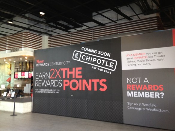 Well, I think we can all heave a sigh of relief… If you’ve been up late at night wondering what was going to take the place of the recently closed Baja Fresh in the mercurial food court of the Westfield Century City Shopping Center, worry no more! Signs just went up indicating that the empty space will soon be inhabited by a branch of national burrito chain Chipotle.