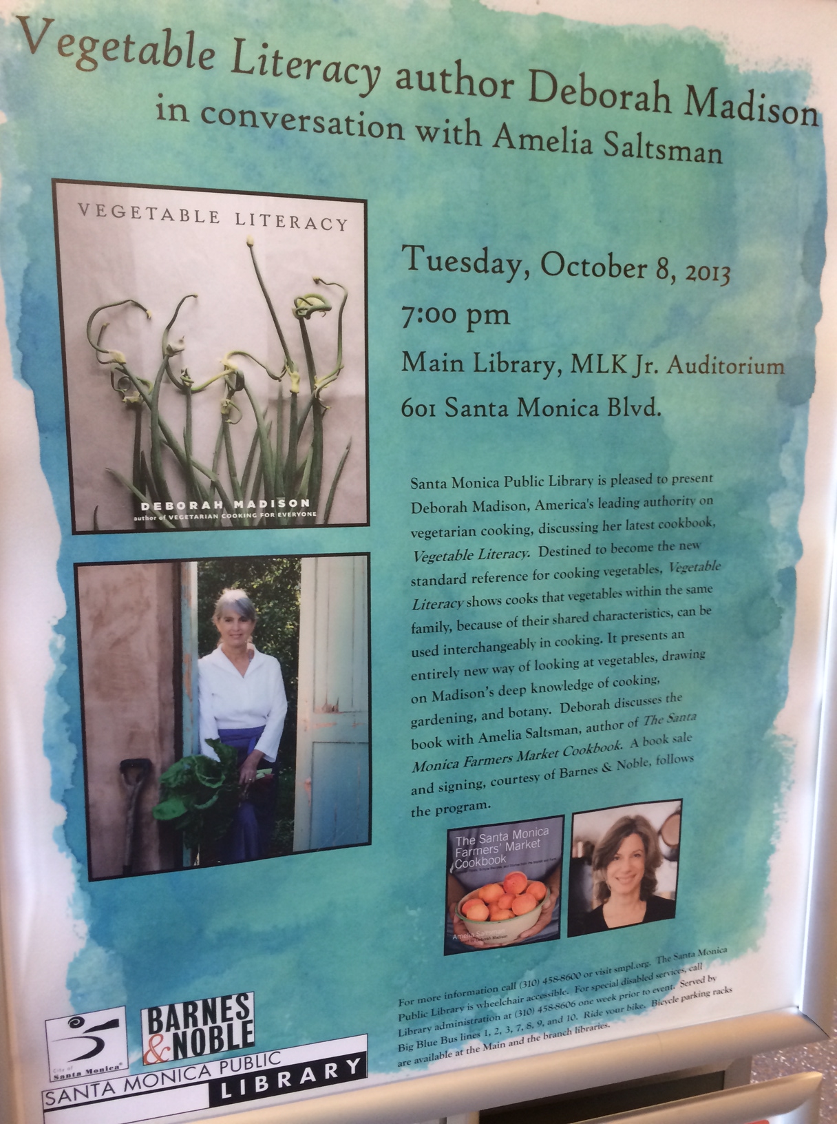 If you’re a vegetarian (or even if you’re not) you’re probably a fan of prolific author, farmer’s market ambassador, and slow food advocate Deborah Madison. As well as being the founding chef of Green’s Restaurant in San Francisco, still an influential pillar of the Bay Area’s food scene, Madison has written numerous books, including the classic Vegetarian Cooking for Everyone. Tonight (Tuesday 10/08/13) at the Santa Monica Public Library at 601 Santa Monica Blvd., Deborah Madison will be discussing her latest book Vegetable Literacy with Amelia Saltsman, author of The Santa Monica Farmers’ Market Cookbook. The event will begin at 7:00pm in the MLK Jr. Auditorium and will be followed by a book sale and signing.