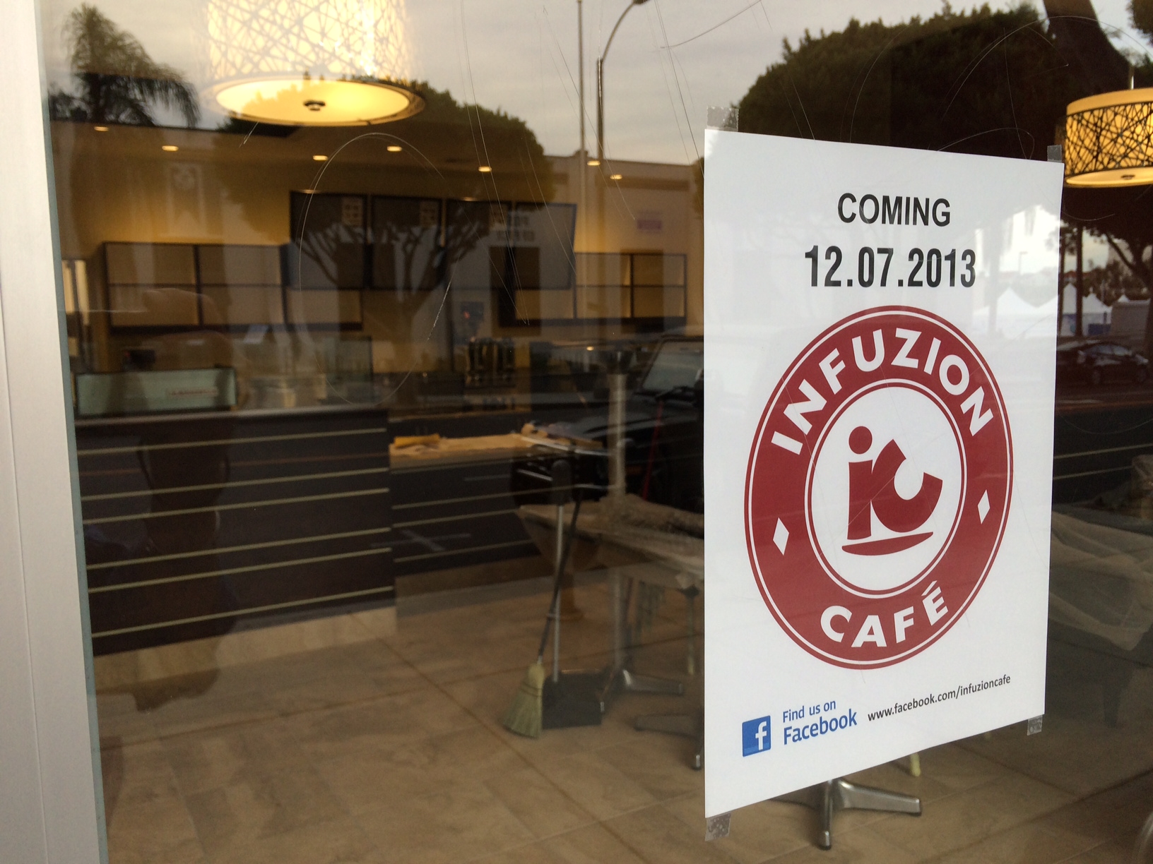 Previously located on 3rd St., Infuzion Café has been moving into the space at 1241 5th St. in Santa Monica for a long time now. Their didn’t quite make their predicted Spring 2013 opening, hardly surprising for SM. But signs are now up in the window announcing that they will officially open their doors on December 7th. infuzioncafe