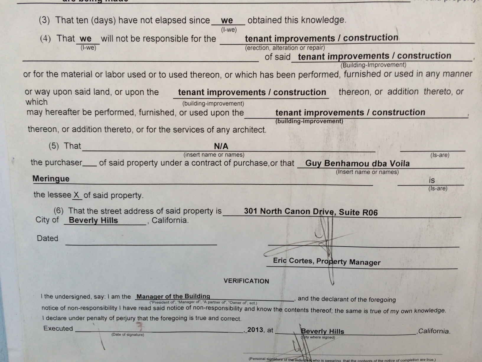 I happened to notice this notice of non-responsibility posted in the window at 301 N. Camden Dr. Suite R06 (according to the notice, the number on the storefront is 319 Canon) in Beverly Hills announcing the impending arrival of a bakery and dessert shop named Voila Meringue. Not much information out there except a Facebook page that you can check out here.