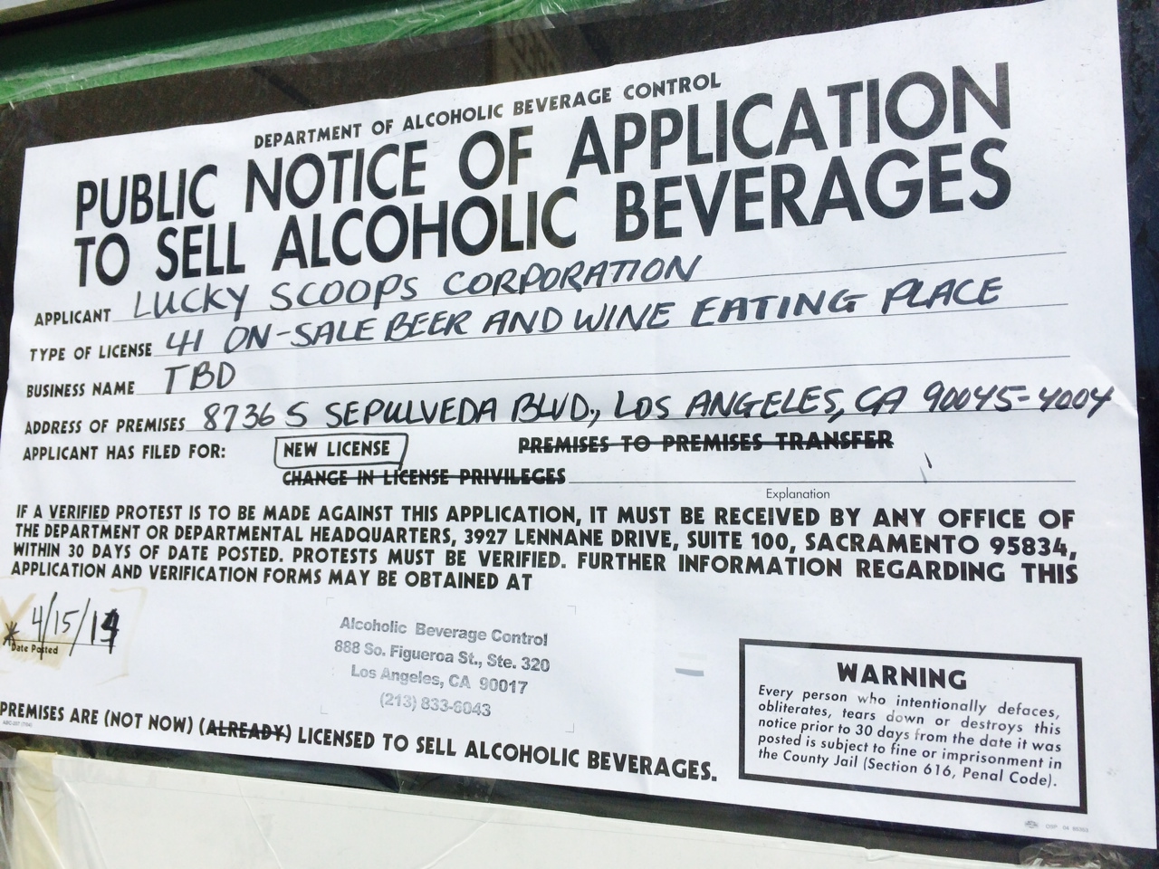 I recently noticed an ABC application for a new “beer and wine eating place” posted in the papered-over window of 8736 (unit C) South Sepulveda in Westchester, right next door to the newish Original Brooklyn Water Bagel Company. While the name of the future restaurant is listed as “to be determined”, the parent company is the Lucky Scoops Corporation, about which I’ve had little luck finding any information. So, I’m afraid we’ll just have to wait for details and as always, I’ll keep my eye on it…