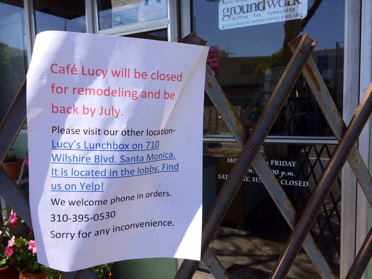 Charming little lunch boîte Café Lucy, on the corner of Lincoln and Wilshire (1227 Lincoln) in Santa Monica, has posted signs indicating that they have temporarily closed down for renovations. Long a favorite of the local business crowd, they are planning on being back up and running in July. Until then, their other location is still open on the corner of Wilshire and 7th.
