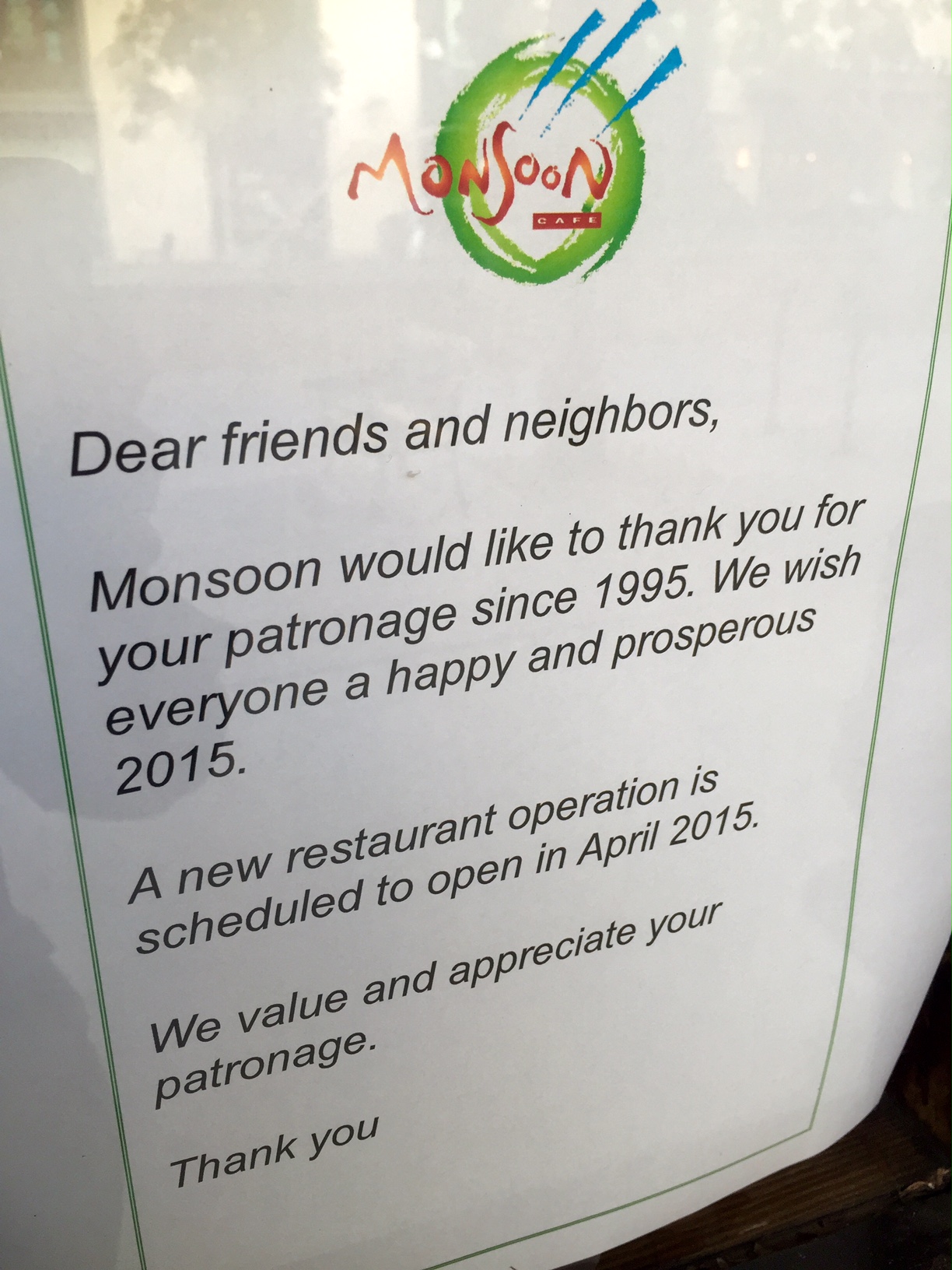 Well I sure didn’t see this one coming, but it looks like one of Santa Monica’s favorite pan-Asian restaurants (and occasional salsa dance lounge) Monsoon Cafe, has ended its long run of 18 years at 1212 3rd St Promenade. According to the goodbye letter posted on the front door, those giant Nepalese Buddha eyes that have gazed down on this quieter section of the Promenade between Wilshire and Arizona will soon be painted over to make way for a new, unnamed “restaurant operation”. Whether this means the new eatery will be by the same owners or an entirely different company, I’m not certain. No word on what the replacement will be, but it appears they’re aiming at being up and running by April of this year.