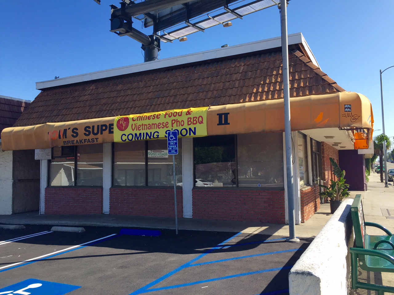 I recently noticed that signs are up announcing the impending arrival of a new Asian eatery to the empty space that used to house the unremarkable branch of mini-chain Tom’s Super Burger at 1710 S. Robertson Blvd. (corner of Airdrome) in West LA. Looks like we can expect a mysterious entity named A F Chinese Food & Vietnamese Pho BBQ to soon throw open its doors. No word on when that thrilling moment will occur, but we’re all waiting with bated breath…