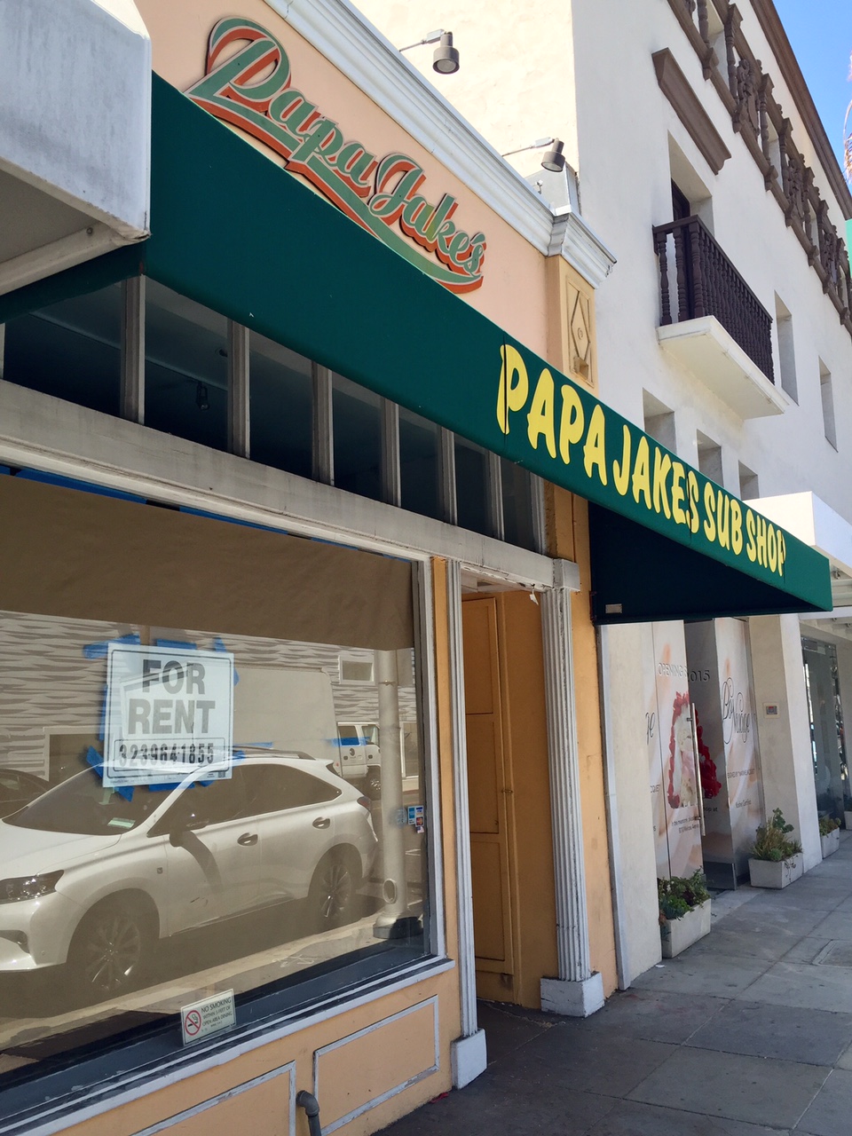 While we’re on the subject of closures… I recently noticed that longtime neighborhood sandwich shop Papa Jake’s Sub Shop at 9527 Santa Monica Blvd. in Beverly Hills has closed its doors. And it looks like they haven’t lined up a new tenant yet as evidenced by the “for rent” signs posted in the window. I’ll keep my eye on it.