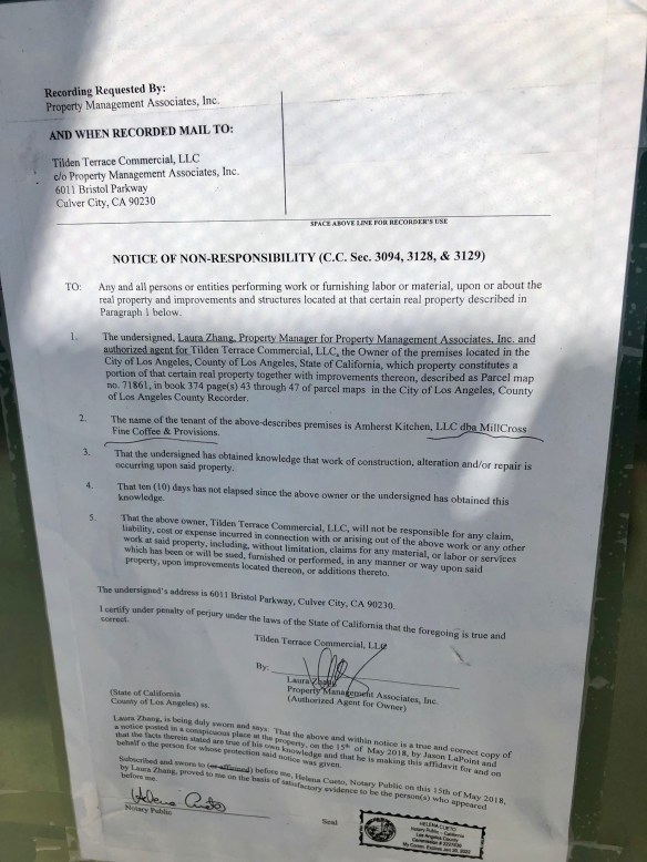 There’s a notice of non-responsibility taped to the front of the new space at 11050 Washington Blvd. in Culver City. If you study the tiny writing, it reveals that a new business named MillCross Fine Coffee & Provisions is moving in. Not much out there on Millcross yet, but I’ll keep watching…