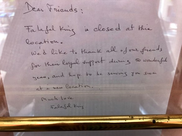 Well this was a shocker…  After having anchored the Westwood Village food scene since, well… forever, Falafel King has closed up shop at 1010 Broxton Ave.  I’m not sure what took out the neighborhood institution, but a gracious handwritten note on the door thanks their loyal supporters for “50 wonderful years” and suggests that they are looking for a new location.