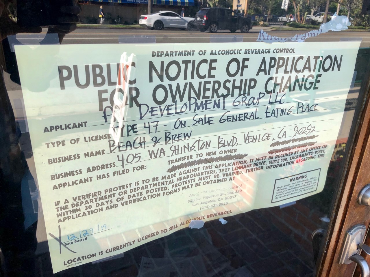 When landmark Kifune Sushi Bar closed up shop at the end of last year after 34 years due to the owner’s retirement, it left a giant hole at 405 Washington Blvd in Venice. Now it looks like a new venture is giving the prominent corner a go: An ABC application taped to the front door informs us that something called Beach & Brew is moving in. I can’t seem to find much on B&B, so if you have information let me know…