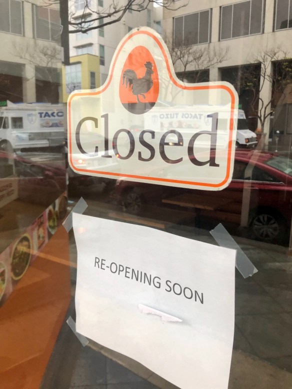 On a tip from a reader (Thanks Adrian!), I went by to check on the suspect state of affairs at 508 and 510 Santa Monica Blvd. in Downtown Santa Monica.  The reader had told me that next door neighbors Seasalt Fish Grill and Yogiyo Korean BBQ had closed down.  Sure enough, both are locked tight.  However, both also have exactly the same sign in the window saying that they will be “re-opening soon”.  I don’t want to pronounce them permanently closed, but we’ve seen this before…