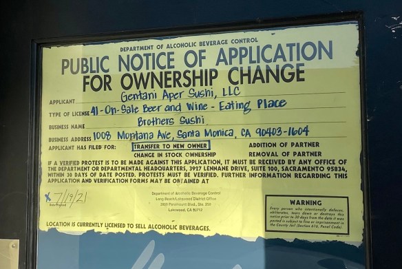 I’ve known for a little while that this was going down, but I wasn’t at liberty to tell you. Now I can officially announce that the space at 1008 Montana Ave., formerly home to a branch of Maria’s Italian Kitchen, will be the future Westside home to Woodland Hills’ Brothers Sushi. An ABC application appeared this week on the front of the location confirming the news. The Brothers Sushi is the much-lauded and wildly popular “high-end” sushi spot that offers seasonal “Omakase Chefs courses or Ala Carte options”. This is indeed exciting news for the burgeoning SaMo restaurant scene.