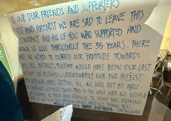 It saddens me to see Westside time-honored institutions close.  It can feel like the end of a classic era.  Sadly, it appears that Da Pasquale Trattoria has left their commodious home at 9749 S Santa Monica Blvd in Beverly Hills.  A gracious note on the front door doesn’t give a reason but expresses gratitude and love to its loyal customers for the last 35 years.  Thanks for the memories…
