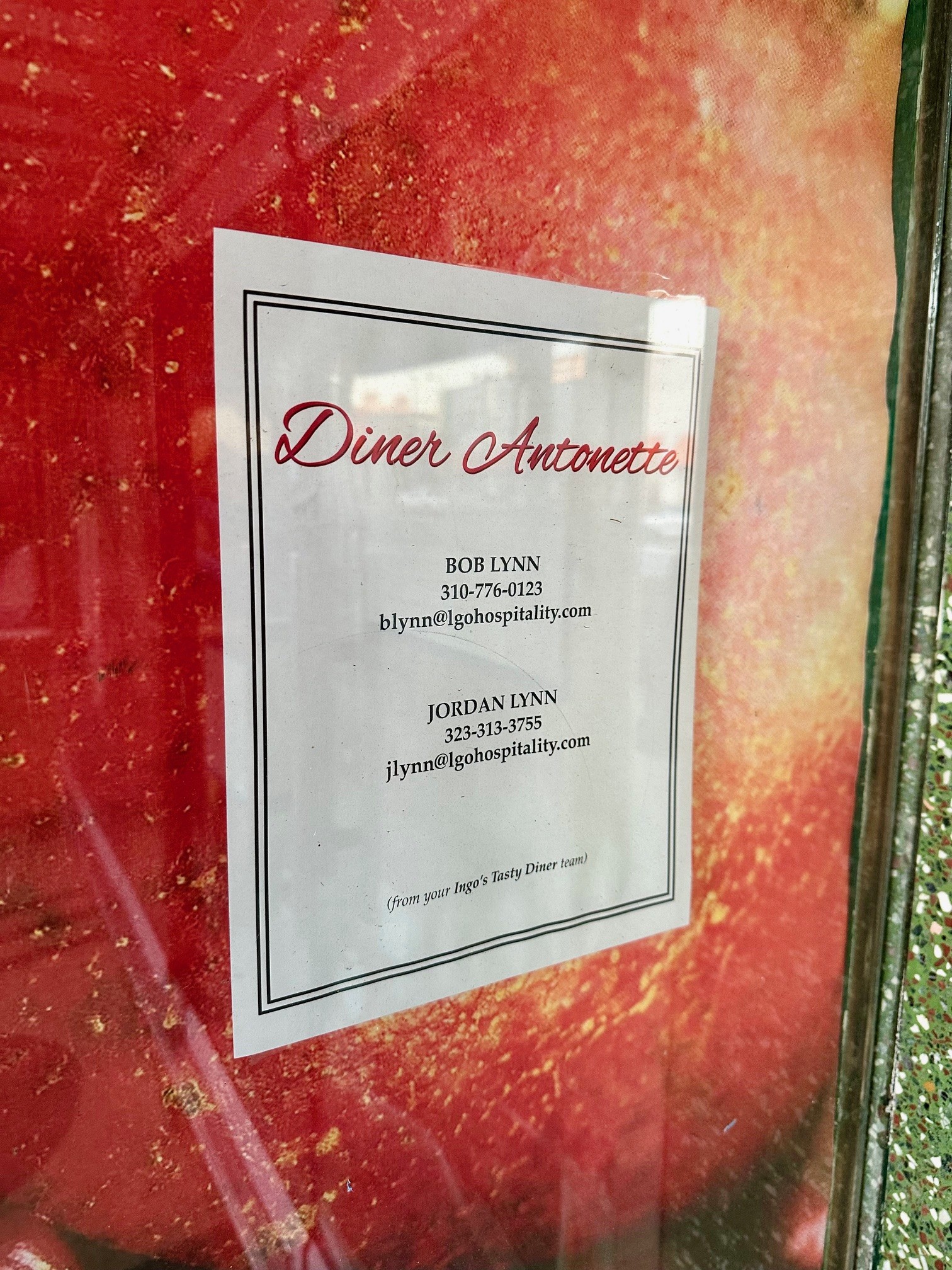 Local laid-back neighborhood spot Ingo’s Tasty Diner, at 1213 Wilshire in Santa Monica, has been closed for years.  What was expected to be a quick remodel started… and then completely stopped.  Over a year ago, a new spate of construction prompted me to write an update.  Not much happened after that and many believed that the project was dead.  Recently however, there is renewed activity.  As you may recall, Ingo’s has taken over the old Vienna Bakery space next door. Window paper has gone up with images of New York, LA, and even Julia Child, and there is a paper in one of the windows with the name Diner AntonetteLGO Hospitality Group (the parent company for Ingo’s, The Misfit, Luggage Room Pizza, and others) is still behind the project, and the website promises a return of Ingo’s Tasty Diner.  Why the delay?  I’m told that parts of the building are historic and complicated the permit process.  But now construction is fast and furious (although they appear to have a way to go) and I’m also told they are hoping to be open by “The Holidays”.