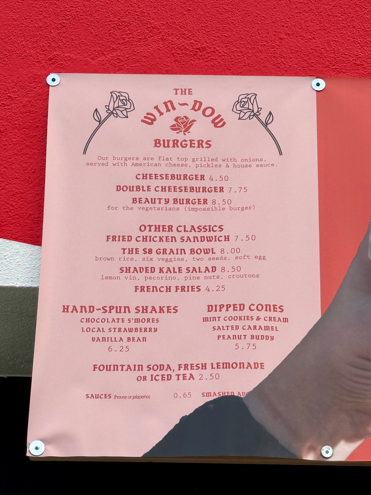 Shortly after GGET pulled out of their location at 930 Montana Ave in Santa Monica, I heard rumors that a new burger joint was moving in. Thanks to all the sharp-eyed readers who wrote to tell me that banners recently went up letting us know that this will be an outpost of The Win-Dow. With 6 locations around SoCal, The Win-Dow specializes in “classic smash burgers, fried chicken sandwiches, and $8 grain bowls”, but also offers a shaved kale salad, a vegetarian burger, hand-spun shakes, and dipped cones.