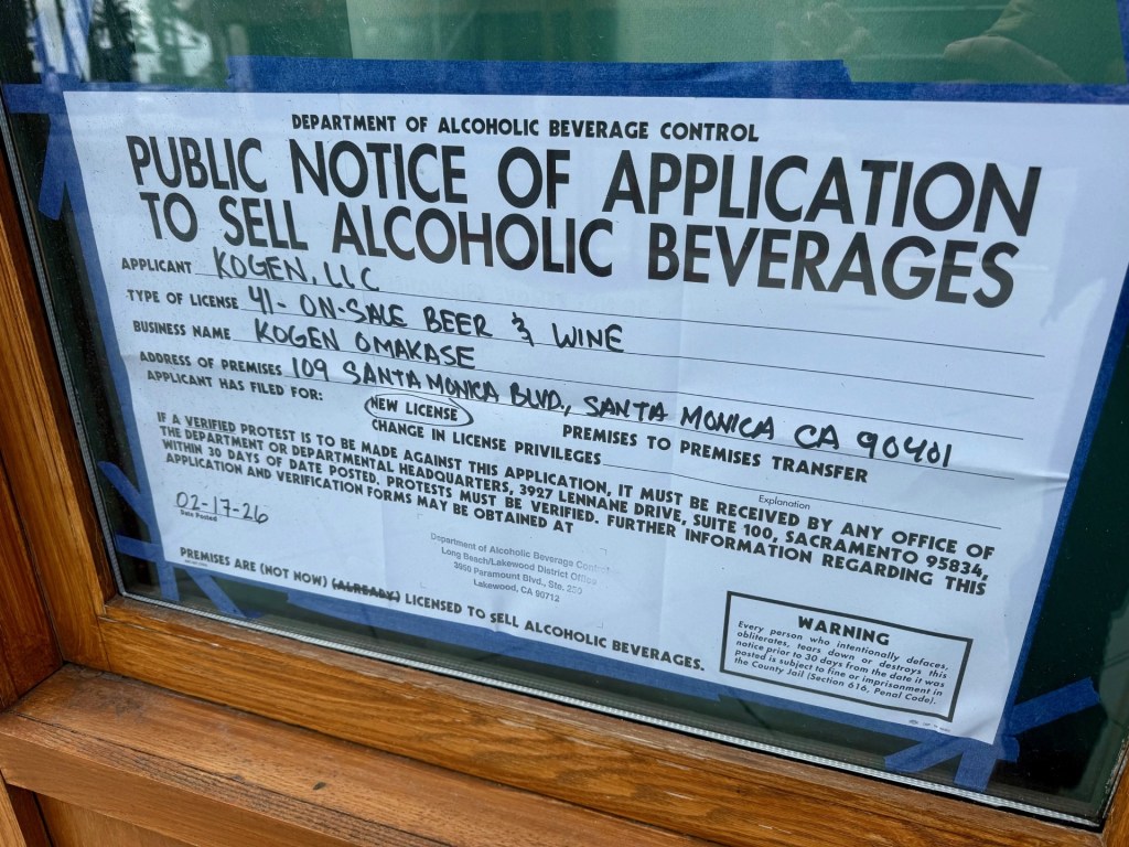 Adorable, but short-lived Bar Monette caused quite a sensation when if opened in 2023. Then it quietly slipped out of its location at 109 Santa Monica Blvd in Downtown Santa Monica. Now the troubled space (also previously home to another flashy eatery Red Ruby before Bar Monette) is getting a new tenant. There’s a new ABC application in the window announcing the impending arrival of Kogen Omakase. I can’t seem to find a lot of information on the new Japanese restaurant, so if you have more info let me know.