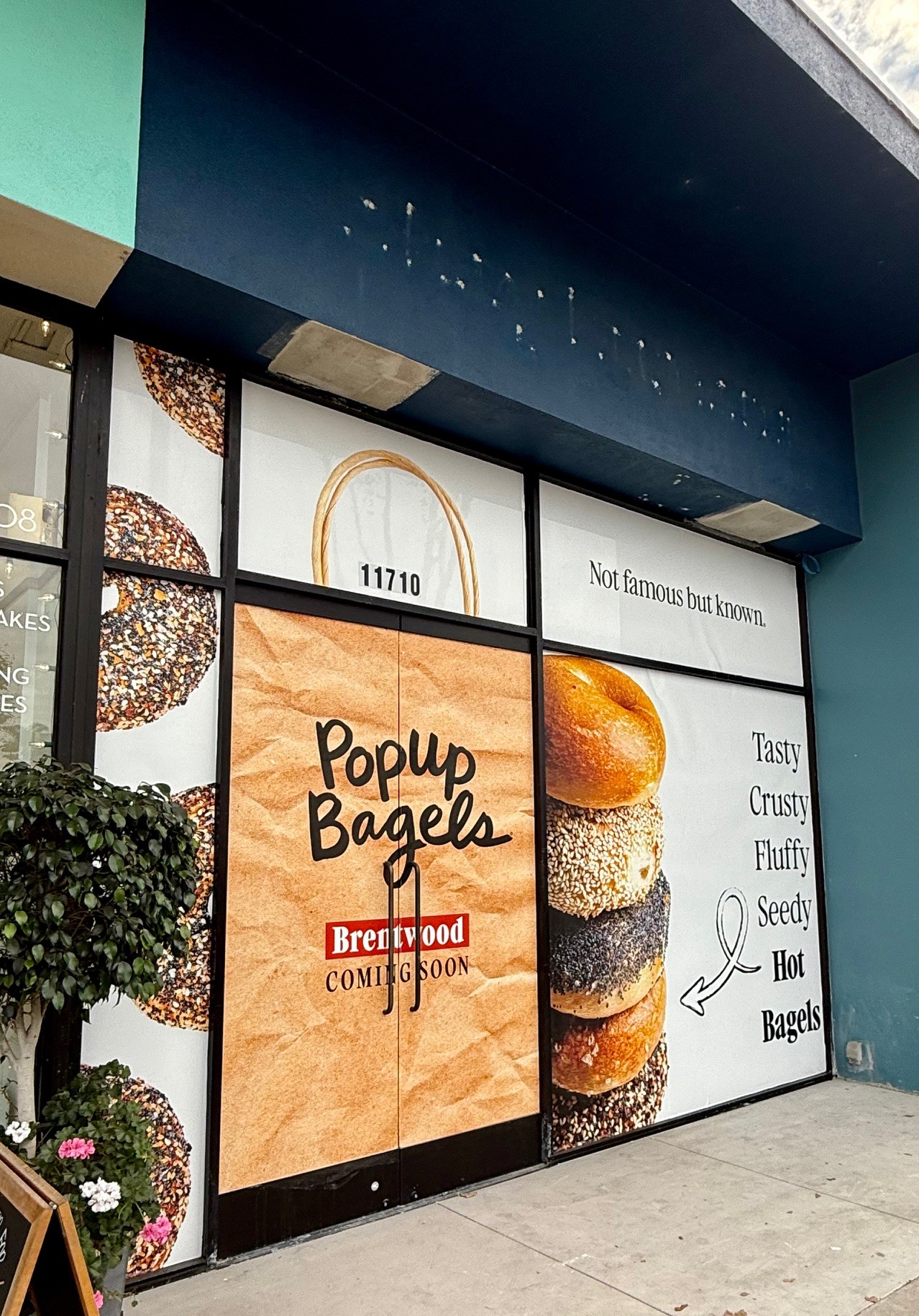 The triumphant return of the carbohydrate continues with its inexorable victory march across The Westside… There’s window paper up on the space at 11710 San Vicente Blvd in Brentwood declaring the impending arrival of PopUp Bagels. (Not to be confused with Pop’s Bagels just up the street.) They began as a backyard pickup window and have since spread to locations up and down the East Coast. PopUp Bagels has a simple goal: To offer “best, freshest bagels. No frills, plainly perfect: crispy crust and soft crumb center, just the right size and with a perfect proportion of seeds.” This new location, and another in La Jolla, appear to be the first on our side of the Country.