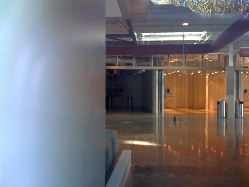Ok, I apologize for the rotten photo, but it’s difficult to get photos of the progress on the Market at Santa Monica Place due to the plastic banners covering the window. With the projected opening of May 20th, I’m keeping a close eye on what’s going on. The bones look finished, but fuse boxes and fixtures are still exposed at this point. And no one has even begun moving in. I’ll keep you updated.