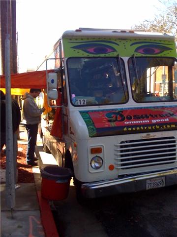 This past Saturday, a myriad of food trucks parked at TLofts in West LA for a benefit for the Red Cross to assist Haiti. We had to check it out. Competition was stiff as the breeze brought sweet scents from the likes of Buttermilk Truck, The Grilled Cheese Truck, Sweets Truck, and others. But as we only had a few minutes, we headed straight for Dosa Truck. I love innovative Indian food and have often been disappointed in LA. (Tanzore has great ambiance but ok food, and Bombay Cafe hasn’t changed its menu in how many years?) It would make us very happy to see an Indian resto the likes of which you see in London such as Amaya. Until that day, one may have to look for little glimmers of hope in the smallest places. Dosa Truck’s Mong was very sweet to accomidate our lack of time. We had the Goa Goodness, which is spinach, cheese, and mushroom with bright and cheery coconut and tomato chutneys all wrapped in the perfectly crispy dosa (a rice/lentil pancake). It was washed down by a bitingly refreshing ginger/limeade. It made us very happy. (One piece of advice, eat the dosa horizontally. I tipped it upright and a waterfall of chutney flowed into my lap.)