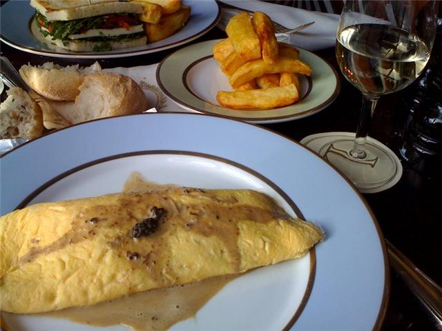 Anyone who’s ever visited the oh-so-French Laduree in Paris (I prefer Laduree Place de la Madeleine) has doubtless never forgotten the experience; the elegant dining room where beautifully dressed ladies in pearls, squeezed in like shimmering sardines in a tin, nibble petite morsels of perfectly executed food between sips of sancerre while pretending not to notice the supermodel who just plucked a succulent maron glacee from a large pile on the counter. Laduree London, nestled at the rear of Harrod’s (turn left at Krispy Kreme), while not presenting the quite same frappe as it’s Continenental sisters, still delivers an utterly charming experience. Imagine, sitting in a sun-drenched (Yes, we had sun that day!) window, with a glass of Marsanne, crusty bread, and the quintessential French omelette with morrels or perhaps a delicious sandwich consisting of a chopped salad of arugula (rocket), sun dried tomato, black olive, parmesan, courgette, aubergine, and olive oil layered between fresh mozzarella on toast with perfect frites stacked like Lincoln logs. Heaven!