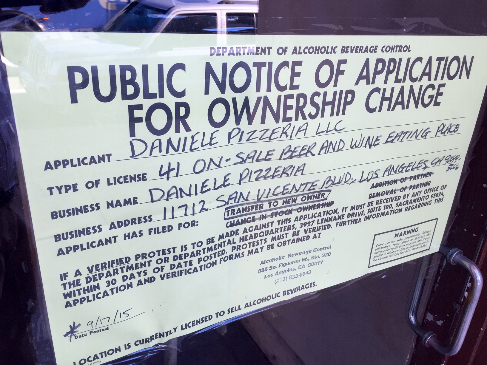 Well that sure didn’t take long. I know that this is Brentwood and all, but this space doesn’t sit idle for long… You may recall that back in late 2013, Adoteca replaced Osteria Latini in a matter of weeks. Then only two weeks ago, I told you and Eater confirmed that Adoteca had bitten the dust. And now, an ABC application is up in the window announcing that a new venture, Daniele Pizzeria will be taking over the busy space at 11712 San Vicente Blvd. I don’t know much about this business yet, but I’ll keep you posted.