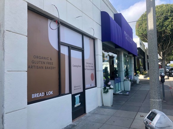 It was almost a year ago when I noticed that Spazio Caffe had vacated its space at 1511A Montana Ave. in Santa Monica. After an extensive build-out, window paper is announcing a new tenant. With locations in SoCal farmer’s markets, it appears that Breadblok is looking to get a brick-and-mortar. Expect a menu of Provence-inspired artisan breads, pastries, and tartines that are “organic, gluten-free, wheat-free, soy-free, gum-free, [and] refined sugar-free”.