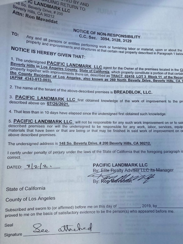 A new tenant may have been found to fill the vacancy left by the closure of Yojisan Sushi at 260 N. Beverly Dr. in Beverly Hills. While there’s no sign up or even any indication of life, a “leased” sign has been slapped on the front. There is, however, a “notice of non-responsibility” taped to the front door. Careful inspection of that appears to spill the beans that the new shop will be nonother than a branch of popular organic and gluten-free bakery Breadblok. You may recall that the farmer’s market fave opened a brick-and-mortar about a year and a half ago in Santa Monica. So yes Beverly Hills, honey lavender cakes may indeed be heading your way…