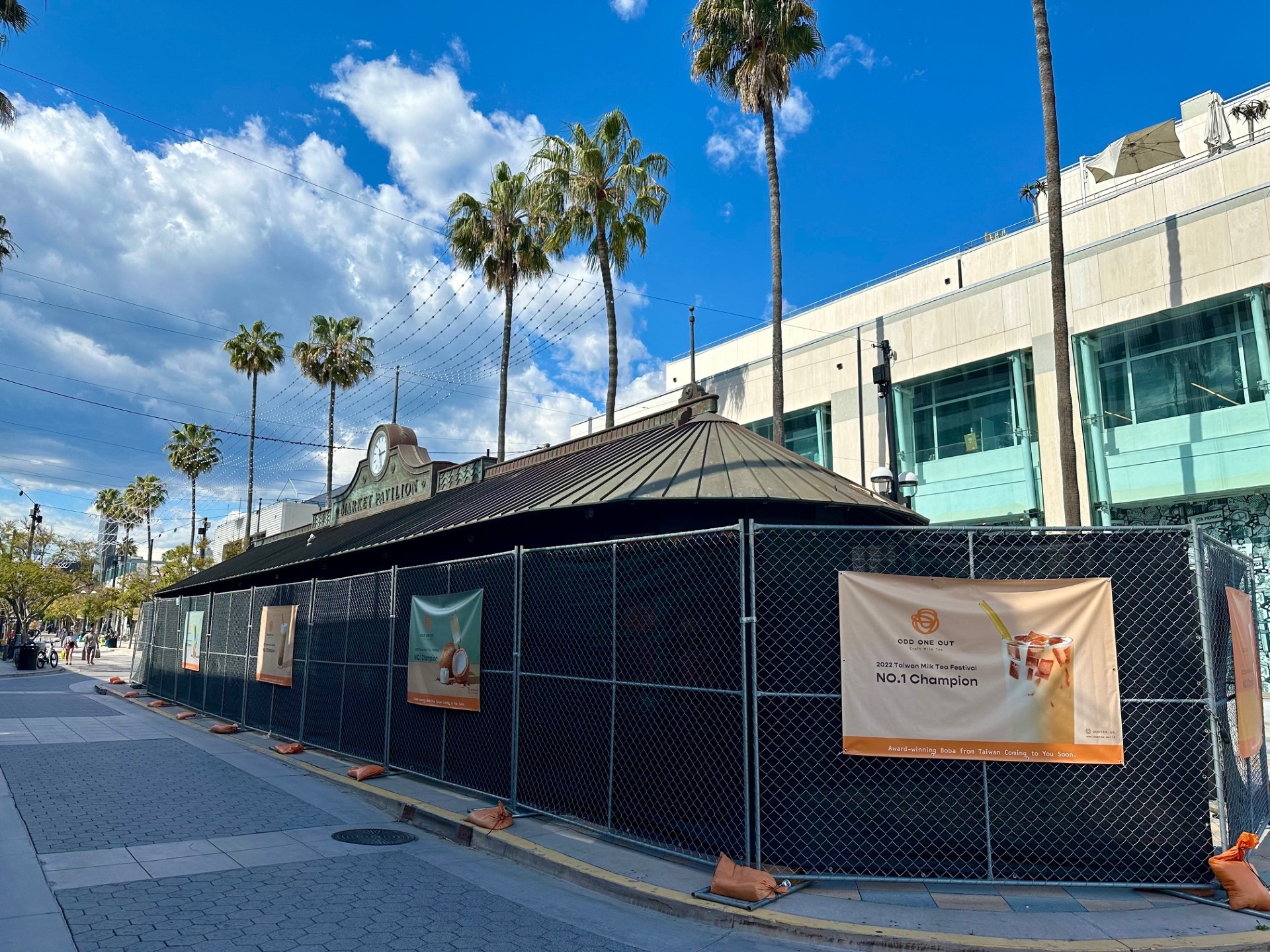 People have been demanding answers from me ever since crazy-popular boba shop Odd One Out Craft Milk Tea announced on their website that there was to be another branch opening in Santa Monica. They didn’t give an address, but the map on the website gave the impression that it was going to be located in the Third Street Promenade. Now we know: Fencing and ‘Odd One Out” banners are now up on the “Market Pavilion” kiosk just to the north of Santa Monica Blvd (1260 Third St. Promenade). With a location in Sawtelle Japantown, Odd One Out hails from Taiwan and was previously the winner of the Taiwan Milk Tea Festival.