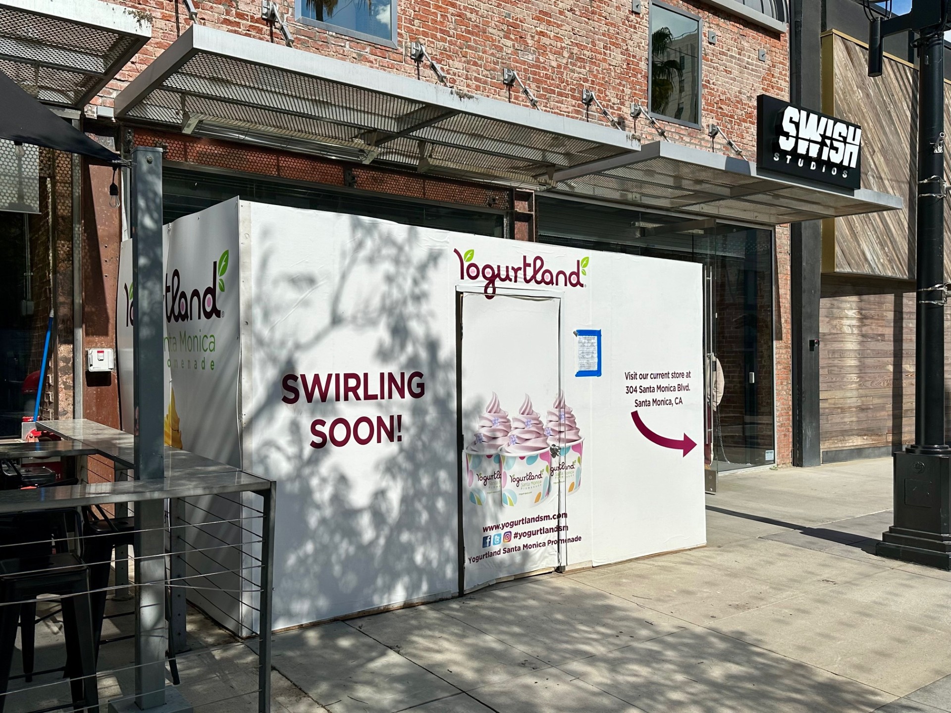 Crowd-pleasing frozen treat purveyor Yogurtland appears to be moving locations in Downtown Santa Monica. They currently have a longtime location at 304 Santa Monica Blvd. But there is new plywood up at 1321 Third St. Promenade announcing the move. Yogurtland began life in 2006 in Fullerton and has since spread to over 250 locations in the US and elsewhere. They pride themselves on the “highest quality ingredients and flavors”.