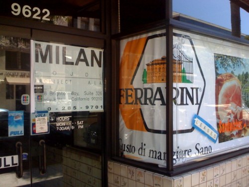 After months of sitting idle (since at least August of last year), construction has finally begun on what will be Italian import market and specialty store Ferrarini at 9622 Brighton Way in Bev Hills in what used to be the old Le Croissant coffee shop. What the delay has been is unclear, but the posters in the window of children cavorting through a bucolic Italian countryside chased by giant Parma hams have been replaced by particle board and scaffolding. I’ll keep my ear to the ground for a potential opening date, until then you can find some of their products (Parmigiano Reggiano) at Vicente Foods in Brentwood.