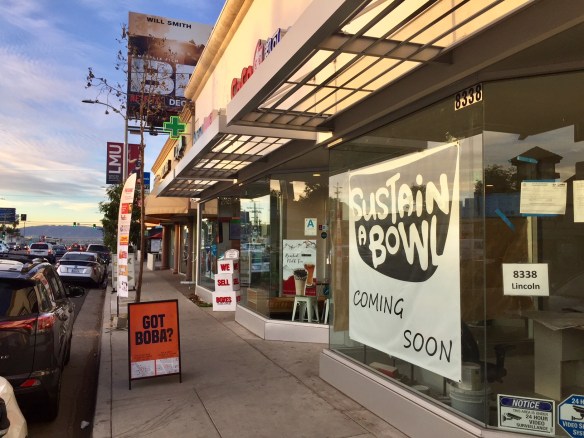 I short time ago, I told you about the window paper covering the space at 8338 Lincoln Blvd. in Westchester that informed us about a new poke joint moving in. Well, plans must have changed because what was supposed to have been Fishbowl Poke Co. will now be something called Sustain A Bowl, at least according to the new window paper. I’m not sure what happened, or when they’ll open, but I’ll keep watching…
