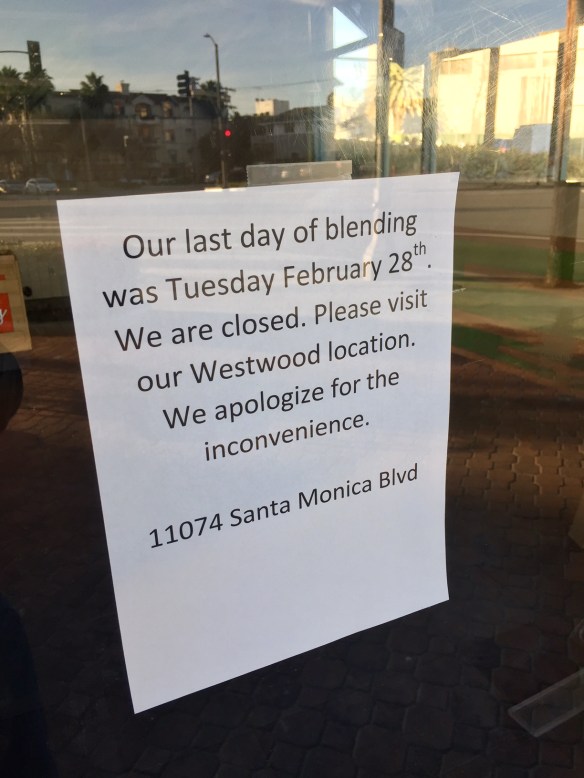 The little strip mall on the corner of Montana and San Vicente in Brentwood seems to have run into a spot of trouble… A while ago, diminutive coffee shop Brew-N-Beans gave up the ghost. More recently, one of the Westside’s last few remaining carb palaces, Noah’s Bagels, quit their location there. And now, it appears that smoothie experts Jamba Juice has closed down. That leaves only scrappy Souplantation in the increasingly vacant mall.