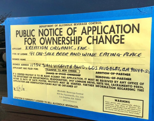 It appears that juice and cleanse experts Kreation Organic has cleared out of its location at 11754 San Vicente Blvd. in Brentwood. That leaves another gaping hole in a block that used to contain many eateries. I’ll keep my eye on the location to see what may develop. And yes, I’m still watching the former Pizzicotto space which appears to have been leased. (Thanks Eric!)