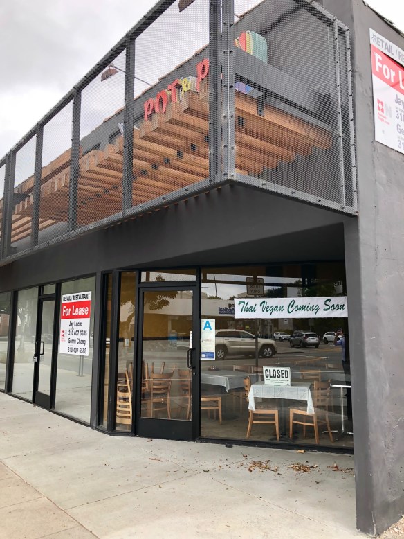 The marquis with the mustachioed chef announced Iranian restaurant Javan for many years at 11500 Santa Monica Blvd. Then Javan transformed into another Persian eatery Safir, which closed last fall. But apparently all is not lost for the plucky purveyor of Persian food. Notices are taped to the windows triumphantly declaring that “Javan is back”. What that looks like exactly, I guess we’ll have to wait and see.