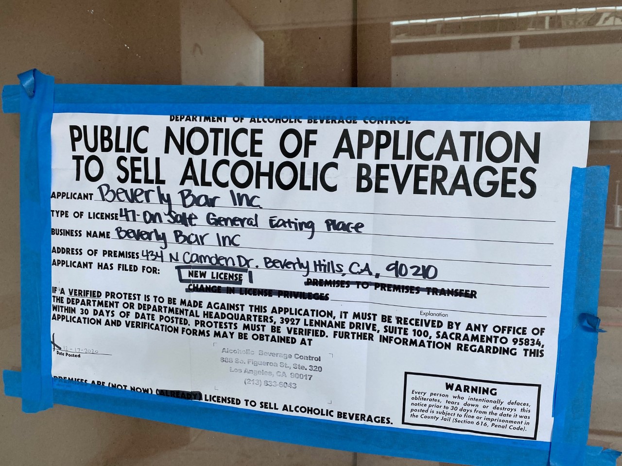 I recently noticed an ABC application taped to the front of what had been formerly understated sandwich shop Everyday Cafe Seletto in a quieter part of The Golden Triangle at 434 N Camden. The application lists the new business as Beverly Bar. According to this article, the owner Matthew Raanan is working in partnership with Chef Felix Garcia owner of Toca Madera and Tocaya Organica. Otherwise, there doesn’t seem to be a lot of info out there quite yet.