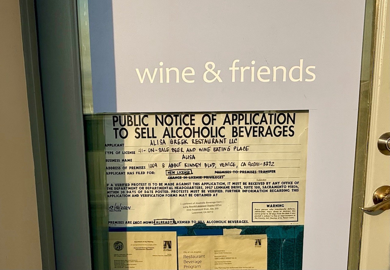 It appears that a new eatery is taking over the former Plant Food and Wine space at 1009 Abbot Kinney in Venice. Window paper and a new ABC application are declaring that Alisa Greek Restaurant is setting up housekeeping at the address. While the website is still being developed, What Now Los Angeles has more details here.